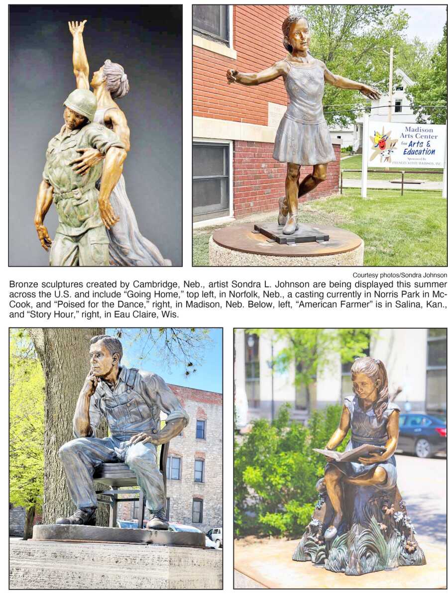 "Description": "CAMBRIDGE, Neb. — For the next year, nine bronze sculptures by Cambridge artist Sondra L. Jonson will be on exhibit across the Midwest through May of 2023. Eight communities in Nebraska, Iowa, South Dakota, Wisconsin, Minnesota and Kansas have selected Jonson’s art to be part of their year-long outdoor sculpture displays. Jonson’s iconic sculpture, “Rachel Weeping for Her Children,” originally created for the Fatima Shrine in Arapahoe, Neb., is now on display in Mankato, Minn. Her “American Farmer” is on exhibit in Mason City, Iowa. “American Farmer” was part of the Salina, Kansas, Sculpture Tour last year and was purchased by The Bank of Tescott in Salina. This year, Salina will feature Jonson’s bronze, “Once Upon a Time” which she originally created for the library in Cedar Springs, Mich. Jonson’s veterans memorial “Going Home,” a casting of which stands in Norris Park, will now be on display in Norfolk, Neb. In neighboring Madison, Neb., Jonson’s new sculpture “Poised for the Dance” is displayed outside the Madison Arts Center. Her bronze “Song of the Sandhill” and “The Story Hour” are now installed in Eau Claire, Wis., while her bronze “Garden Fairy” graces Watertown, S.D. Her new life-size sculpture, “The Calling,” is now on exhibit in Sioux Falls, S.D.